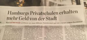 Abendblatt-Titelgeschichte und Senats-Pressemeldung von heute: „Hamburgs Privatschulen bekommen mehr Zuschüsse“ – rund 4 Mio. Euro seien in 2018 und 2019 für die Pensionsrückstellungen aller freien Schulträger vorgesehen, 3,2 Mio. Euro für die Gebäudekosten und 800.000 Euro für den Ganztag …